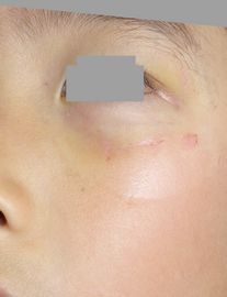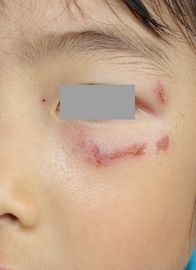5歳7ヶ月男。 2016年5月24日,友達と木の棒を振り回してチャンバラごっこをしていて,相手の木が顔に当たった。翌日,当科を受診。ハイドロコロイド被覆材で治療。