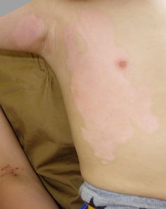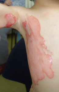 1歳8ヶ月男。 2016年5月19日,テーブルの上のカップみそ汁に手を伸ばして倒し,右側腹部・上腕に熱傷受傷。直ちに当院ERを受診。プラスモイストで治療。 翌日,当科を受診。プラスモイストの治療を継続。