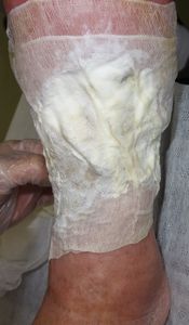 主訴は痛みであった。湿潤治療の原理について説明し,ゲーベンクリームが痛みの原因かも,と説明。ゲーベンクリームを洗い落としてズイコウパッドで創部を被覆したところ,痛みが軽くなった。