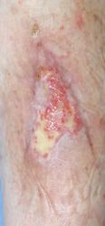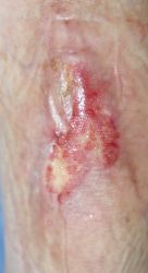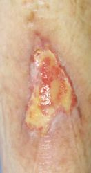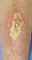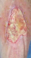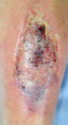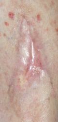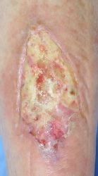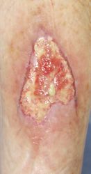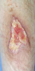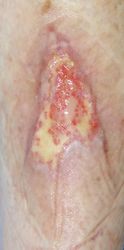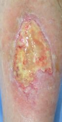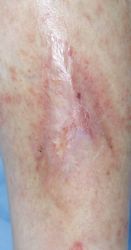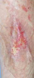 2016年4月30日夜,自転車に乗っていて転倒し,左下腿裂傷。直ちに当院ERを受診し,テーピングで治療。5月2日,当科受診,テーピングを継続した。この時点ではFlap状の皮膚の循環は悪くなかったが,5月6日に受診した際,皮膚色は暗紫色になっていた。ズイコウパッドで創部の被覆を行ったが,皮膚は壊死し,完治までに3ヶ月を要した。