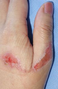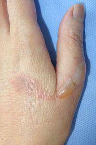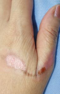 2016年5月28日,麺を茹でていて茹で汁を捨てようとして左手背に熱傷受傷。ネットで検索してラップで覆ってみたところ,痛みがなくなったので病院は受診しなかった。