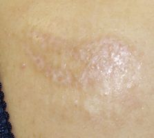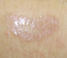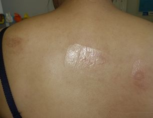 37歳女。 2016年5月22日,中国人経営のマッサージ店で吸い玉療法を受け,水疱ができた。ネットで検索して当サイトで同様症例を発見。 5月23日,当科受診。ハイドロコロイド被覆材で治療。