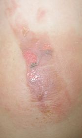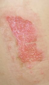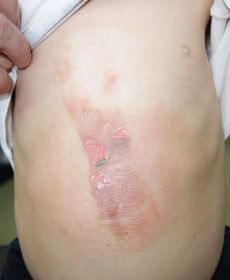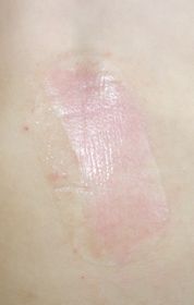 3歳7ヶ月男。 2016年6月4日,カップ麺を食べようとして倒し胸腹部熱傷。直ちに当院ERを受診し,プラスモイストで治療。 6月6日,当科を受診。プラスモイストによる治療を継続。