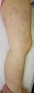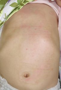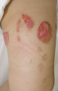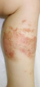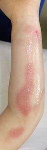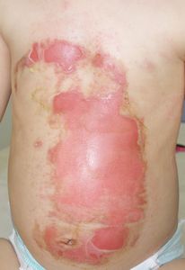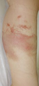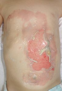 2016年6月25日,食卓の上のお吸い物に手を伸ばして倒し,胸腹部,左下肢などに熱傷受傷。〇〇大学付属△△病院に救急搬送され,アズノール軟膏で治療後に,当科への紹介状を書いてもらった。6月26日,ガーゼが創面に固着して痛がっていたため,ネットで調べてラップに替えたところ痛がらなくなった。
