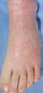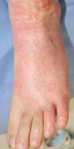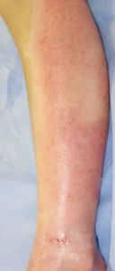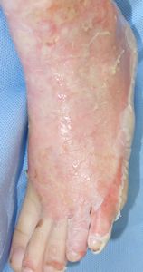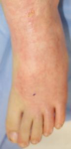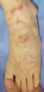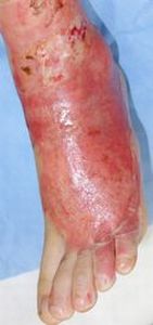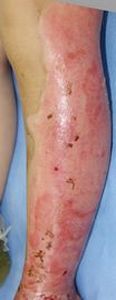 左下肢の状態のみ供覧。右大腿の3度熱傷は小範囲なので無視。