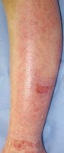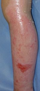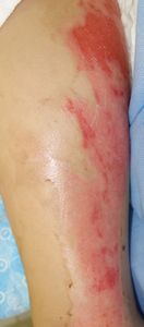 6月17日,当科受診。左下肢は広範な2度熱傷,左大腿は小範囲(直径4センチ足らず)の3度熱傷だった。右大腿はハイドロコロイド被覆材で被覆し,左下肢は穴あきポリ袋で覆って吸収シートで覆う方法で治療。