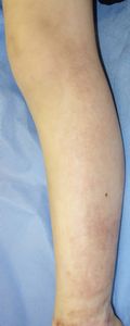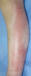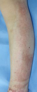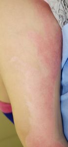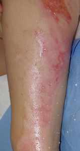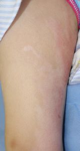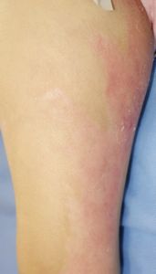 2016年5月1日,料理の手伝いをしていて椅子に立ってカレーの鍋をかき回していて足を滑らせて転倒し,落ちてきた鍋の熱湯で両側大腿,左下腿,左足背に熱傷受傷。〇〇大学△△病院に救急搬送されて形成外科入院となった。石鹸洗浄後にバラマイシンとフィブラストスプレー®で治療。5月31日,担当医からいきなり「右大腿は深い3度熱傷のため,直ちに手術が必要。来週火曜日に手術なので今日採血します」と説明された。それまで手術の話は一切なかったため,両親は不信感をいだき,ネットで「熱傷 植皮しない」と検索し,筆者にメールで相談。6月17日,同院退院後に当科を受診。