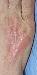 61歳女。 2016年5月29日,蕎麦を茹でていて誤って熱湯を右手背にかけてヤケド。直ちに当院ERを受診しプラスモイストで治療。 6月1日,当科受診。プラスモイストの治療を継続。