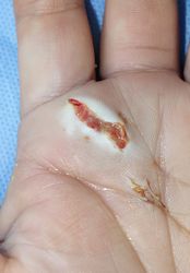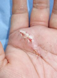 2016年6月18日,近所の飼い犬に左手を噛まれ,直ちに当院ERを受診。脂肪に達していることを確認後,創内を洗浄し,テープで閉創。抗生剤が処方された。帰宅後,痛みが強くなり,19日は痛みで眠れず,指も動かなくなった。