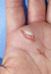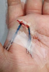 6月20日,当科受診。局所麻酔下に排膿してナイロン糸ドレナージ,表面はズイコウパッドで覆った。翌日には痛みはなくなってて指が動かせるようになった。2日間,ドレナージを続けた。