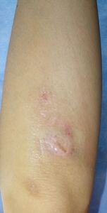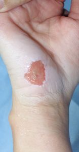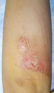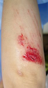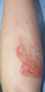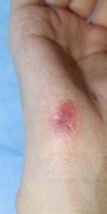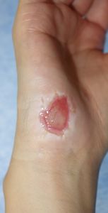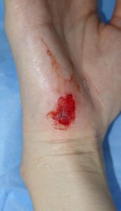 35歳女。 2016年6月23日,自転車に乗っていて転倒し,右前腕,右小指球部を擦りむいた。直ちに当科を受診。ヘモスタパッドで創部被覆。翌日からはプラスモイストで治療。