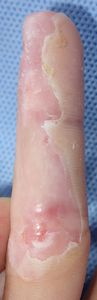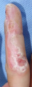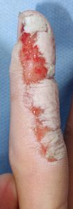 10歳男。 2016年6月5日,自転車に乗っていて転倒した所に車が通りかかり,右手をタイヤに轢かれた。直ちに当院ERに救急搬送され,骨折はなく右環指挫創のみ。プラスモイストで治療。 翌日,当科を受診。プラスモイストの被覆を継続。