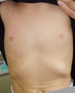 2016年9月2日,母親が水筒に煮沸消毒用の熱湯を入れてテーブルに上に置いていたところ,手を伸ばして倒し,胸腹部熱傷。〇〇病院に救急搬送されてアズノールで治療。その後,△△病院皮膚科に紹介されて受診。バラマイシン軟膏が処方された。両親がネットで検索し,父親の実家が練馬のため,沖縄から受診。