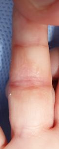 4月12日,当科受診。すでに治癒寸前で拘縮が起こる可能性はゼロであることを説明。ハイドロコロイド被覆材で治療。