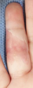 2017年4月7日,炊飯器の蒸気で右手にヤケド。8日,〇〇病院救急室を受診し,ゲンタシン軟膏が処方された。4月11日,〇〇大学付属病院形成外科を受診。今後,拘縮が起きて指が伸びなくなり,手術が必要になる可能性が高いと説明された。両親がネットで調べ,当科に紹介状を書いてもらった。