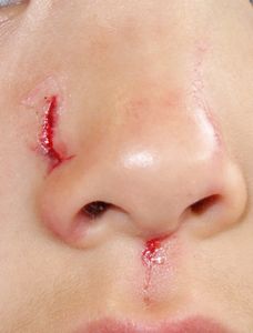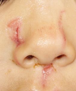 5歳8ヶ月男。 2017年4月10日,自転車で遊んでいて転倒。直ちに当科を受診。ヘモスタパッドで被覆して止血。翌日からはハイドロコロイド被覆材で治療。