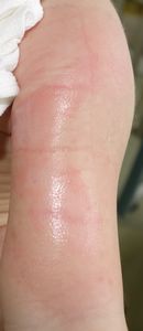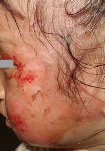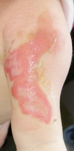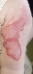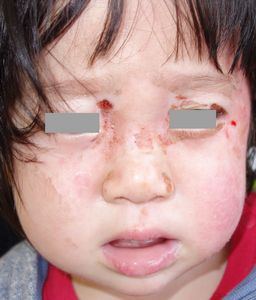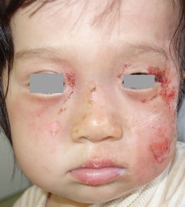 2017年4月9日夜,台所のテーブルの上のコーヒーに手を伸ばして倒し,顔面,左上肢,左背部に熱傷受傷。〇〇大学付属病院に救急搬送され,軟膏ガーゼで治療。翌日からは自宅近くの△△皮膚科に通院。リンデロン軟膏とガーゼでの治療となったが,ガーゼを剥がすたびに出血して大暴れする様子を見て,父親はこの治療はおかしいと直感。ネットで検索。