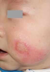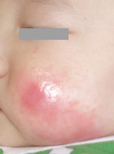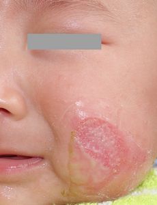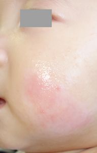 2017年4月18日,鼻づまりがひどいため対処法について本を読むと「水蒸気を吸わせればいい」とあったため,子どものそばに熱湯の入った容器を持ってきたところ,容器に手を伸ばして顔にヤケド。〇〇病院救急室を受診。プロペトとガーゼで治療。以後も同科に通院。「あとが残るかどうかは2ヶ月後でないとわからない」と説明された。もっといい治療はないかと両親はネット検索。