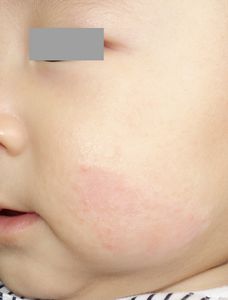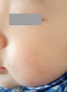 お風呂上がりや、泣いたときなどは一時的に赤みが目立ちますが、普段の生活においてほとんどわからなくなってきました。最後の診察からわずか一ヶ月でここまで綺麗になるとは思わず、嬉しい驚きです。熱傷の赤味よりよだれかぶれのほうが目立つほどでした。