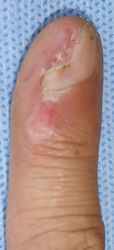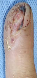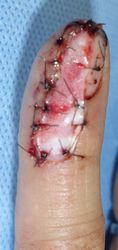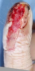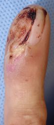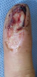 4月26日,当科を受診。直ちに人口真皮のシリコン膜を除去し,プラスモイストで創部を被覆。1ヶ月ほどで一部変形を残したものの再生した。指は普通に動き,知覚も正常であり,元の仕事に復帰した。