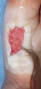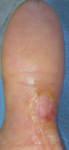 初診時,母指と示指の基節部掌側に水疱形成を認めた(左示指はDIP関節で欠失)。直ちに水疱膜を除去し,プラスモイスト(R)で創面を被覆した。