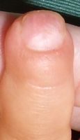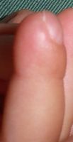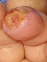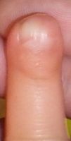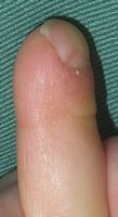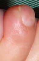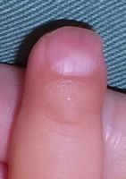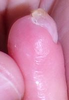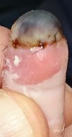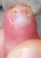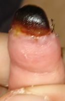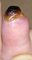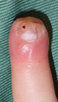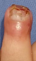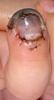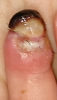 2018年2月6日,真ん中で折れるタイプのテーブルを触っていて右中指を挟まれ,指尖部切断。〇〇大学附属病院に救急搬送され,形成外科で縫合手術(Composite graft)を受けた。以後,通院していたが,次第に黒くなり,2月14日に「入院して指を短くする手術が必要」と説明を受けた。両親がネットで指壊死について検索。