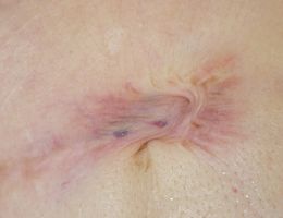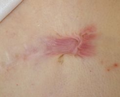 10年前に右乳がんの手術を受けたが,数年前から傷跡が盛り上がってきて痛みと痒みがある。2018年3月5日,当院受診。ケナコルト局注で治療。