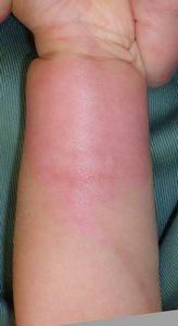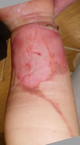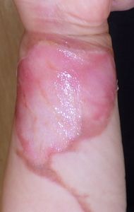 2018年4月23日夜,テーブルの上の味噌汁椀に手を伸ばして倒し,左上肢などに熱傷受傷。〇〇病院に救急搬送され,軟膏ガーゼで治療を受けた。翌日,かかりつけの小児科クリニックを受診したが,ガーゼを当てているのを見て,今はこういう治療ではないと教えてくれ,診察室のコンピュータで当院を調べて教えてくれた。