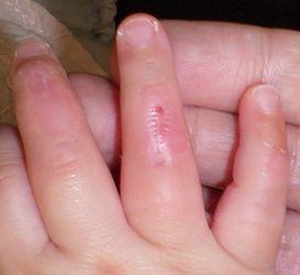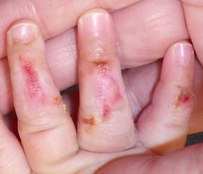 2018年4月8日,秋田県の実家に帰省中にストーブの天板で右手指にヤケド。近くの〇〇皮膚科を受診し軟膏が処方された。その後,ネットを熱傷治療について検索。中通総合病院外科の進藤先生の診察を受け,ハイドロコロイドで治療。