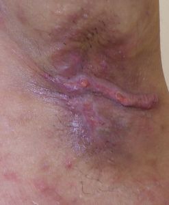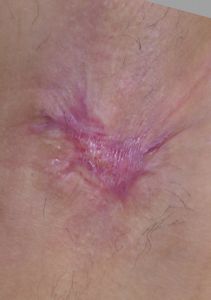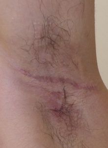 ネットで,他院での腋臭症手術失敗例を多数治療している当院を知り,治療方針も納得できたため,7月3日に受診。ズイコウパッドで治療。