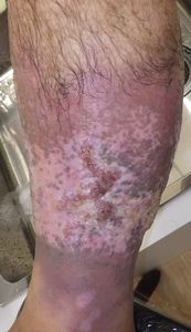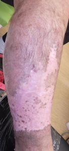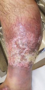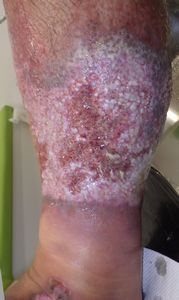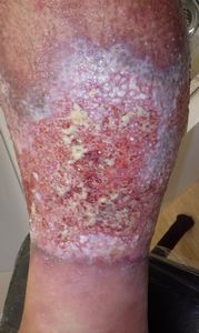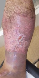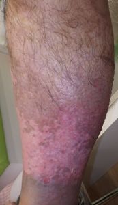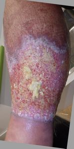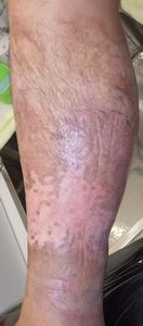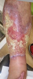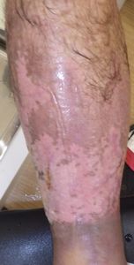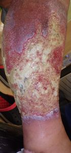 7月17日,当院を受診。右下腿の全周性3度熱傷で,壊死組織が付着していた。ゲーベンクリームと石鹸洗浄,メロリーガーゼで傷が深くなった熱傷だが手術しないで完治化膿であると説明。ズイコウパッドで治療。