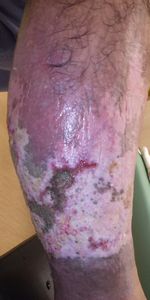 2018年6月8日,自宅裏で焚き火をしようとして,火の付きが悪いためラジコンの燃料(アルコール+ニトログリセリン)をかけたところ爆発してズボンに引火。〇〇病院に救急搬送されて治療を受け,以後,同院形成外科に通院している。石鹸でよく洗うように指導され,ゲーベンクリーム®,メロリンガーゼ®で治療。手術しないと治らないと何度も説明を受けたがその都度拒否した。そこまで言うのならと,主治医は当院に紹介状を書いてくれた。