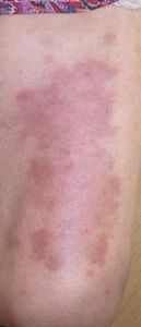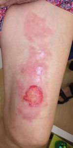 2018年7月18日,鍋をひっくり返して両側大腿熱傷。娘さん(練馬光が丘病院で治療を受けたことがある)に連絡し,ハイドロコロイド包帯をあててくれ,痛みは治まった。