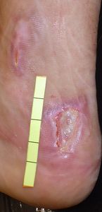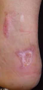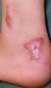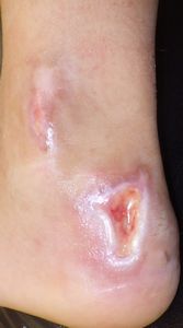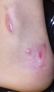 2018年11月下旬,姉の自転車の後ろに乗っていて後輪に左足を巻き込まれてスポーク外傷受傷。〇〇大学△△病院救急室を受診して治療してもらい,翌日からは自宅近くの◇◇整形外科医院に通院。ゲンタシン軟膏で治療。その後両親は,皮膚科のほうがいいと思い,12月5日に◎◎皮膚科を受診。石鹸でよく洗うように説明され,ゲーベンクリーム®が処方された。21日からはフィブラストスプレー®に変更。いつまでも治らず,医者の説明も曖昧であやふやであり,痛みで歩けなくなったため治療に不信感を持ち,両親はネット検索。