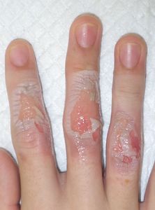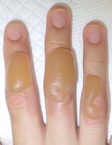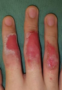 21歳男 2018年11月29日午後,職場(ホテルの調理師)で蒸し器を移動しようとして右手示指,中指,環指に熱傷受傷。職場の同僚が当院で治療を受けていて,受診するようにアドバイスされた。 11月30日,当院受診。水疱膜を全て除去し,ハイドロコロイド被覆材で治療。