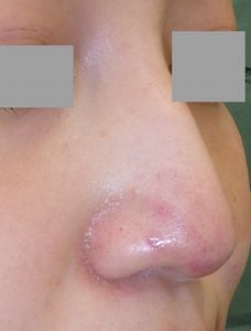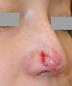 2018年12月24日未明,自宅の犬に鼻尖部を噛まれた。直後からキズパワーパッドを貼っておいた。今までにも何度か手足を噛まれて痕が残り,傷跡を治すレーザー治療を受けているが全く改善しなかったため,傷跡を残さない治療についてネット検索。