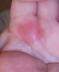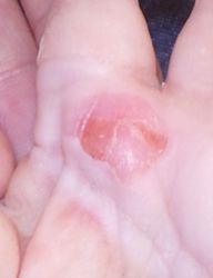 12月3日,当院受診。水疱膜を全て除去し,ハイドロコロイド被覆材で治療。