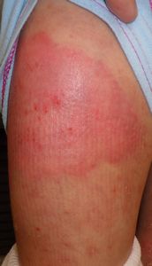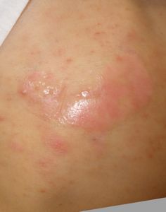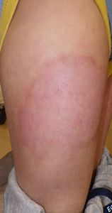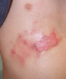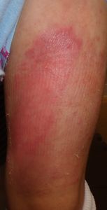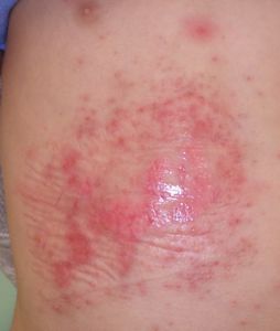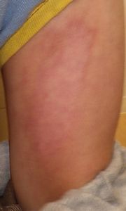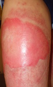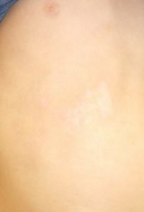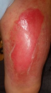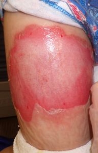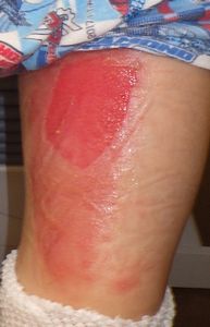2018年12月15日,カップ麺を倒して右胸部,両側大腿に熱傷受傷。〇〇病院に救急搬送されて小児外科入院となる(熱傷処置は形成外科)。石鹸洗浄,アズノール軟膏とガーゼで治療。18日に退院。入院中からネットで熱傷治療について検索したため,退院後直ちに当院受診。