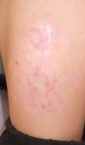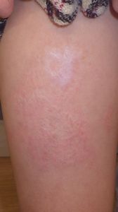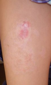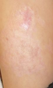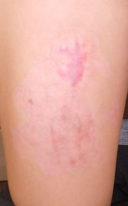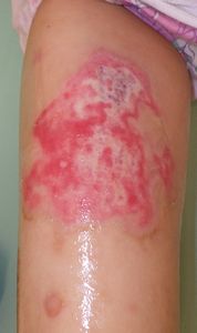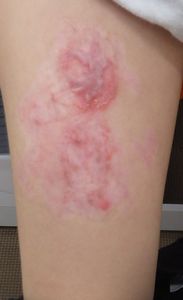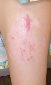 2019年2月17日,両親と回転寿司で食事中,あら汁のお椀に手を伸ばして倒し,右上肢,右大腿に熱傷受傷。〇〇病院に救急搬送され,以後,同院形成外科に通院。フィブラストスプレー®,プロスタンディン軟膏,メロリンガーゼ®で治療。医師に湿潤治療について質問したが,これは乾燥させないガーゼだと説明された。25日,手術が必要と説明されたため,直ちにネットで検索。処置のたびに痛みがひどくて大暴れし,患児も「この病院も医者も大嫌いだ」と言っていた。