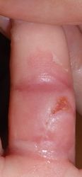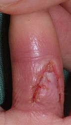 2019年8月12日,姉(2歳)がハサミで遊んでいるところに患児が手を出し,右中指裂傷。直ちに〇〇病院救急室を受診して縫合してもらい,19日に抜糸してもらったが傷が開いた。抜糸した医師から「傷跡が残り,指が動かなくなる可能性が高い」と説明された。両親はネットで検索。