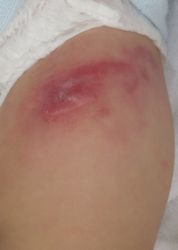2013年5月12日,テーブルの味噌汁椀に手を伸ばして倒し,左大腿に熱傷。直ちに〇〇大学△△病院を受診,翌日からは自宅近くの◇◇皮膚科クリニックに通院しているが,受信するたびに傷が深くなっていると説明され,皮膚移植が必要と言われた。同院では亜鉛華軟膏,イソジンゲル,ユーパスタ,リンデロンVGを処方。医師の説明に不安になり,ネットで調べて当科を受診。