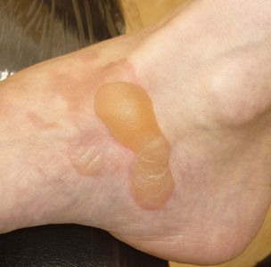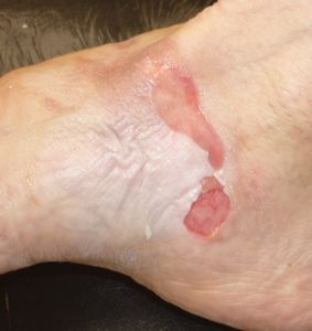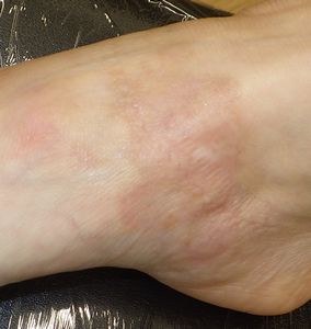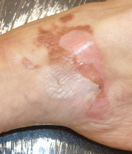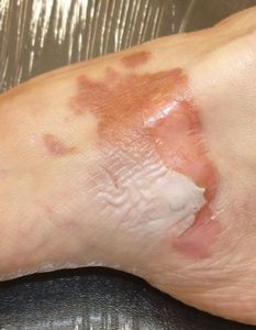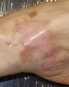 48歳女。 2020年2月10日,ラーメンを落として右足背熱傷。様子を見ていたが痛みが強くなったため,ネットで病院検索。 2月12日,当院を受診。水疱膜を除去してズイコウパッドで治療。