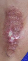 4月28日,当院を受診。プラスモイスト ハイドロコロイド包帯 アドバンスで治療。