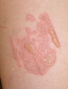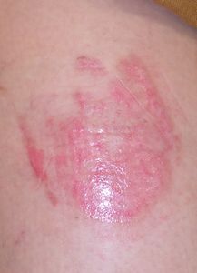 42歳女 2020年5月15日,カップ麺を落として右大腿熱傷。自宅で様子を見ていたが痛みが強くなり,ネットで病院を検索。 5月18日,当院を受診。水疱膜を除去し,ズイコウパッドで治療。