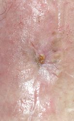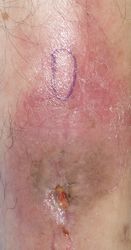5月25日(23日後) 5月22日から傷の頭側に圧痛が出現(マークした部分) 25日に局所麻酔下に切開排膿 |