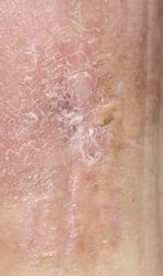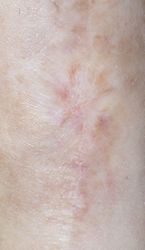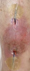 2017年2月8日,品川駅の階段で転倒し,激痛で立てなくなり,〇〇病院に救急搬送され,左下腿骨折で同院整形外科入院となった。2月16日にプレート固定術。3月1日退院。退院時にも創部のカサブタが付いていてなかなか取れなかったが,主治医からは触らないように指示された。その後,カサブタは自然に取れたが,金属が露出したため,同科を再受診し,イソジンゲルが処方され,再手術か,あるいは持続陰圧療法(VAC療法)するしか治療法がないと説明された。仕事の関係でどうしても入院できないため,ネット検索して当サイトでの治療を知り,セカンドオピニオンで受診となった。