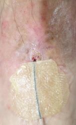 5月2日,練馬光が丘病院を受診。金属が1cm弱露出していてドレナージルートは確保されている状態であったため,吸収力のある被覆材で覆っておけば感染せずに経過する可能性が高いことを説明。金属が見えなくなる可能性はないだろうが,いずれ,プレート除去が必要になるので,それまでの時間稼ぎができれば十分だろうと説明。患者さんも納得。ズイコウパッドで創部被覆。