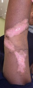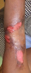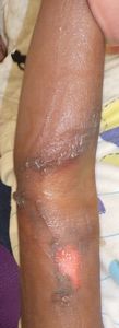 1歳1ヶ月男。インド人。 2020年5月29日夜,テーブルの上の熱いミルクの入ったコップに手を伸ばして倒して左上肢に熱傷。〇〇病院救急室を受診し,ワセリンとモイスキンパッド®で治療。当院に紹介状を書いてくれた。 5月30日,当院を受診。ズイコウパッドで治療。