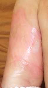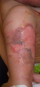 2020年5月24日,テーブルの上の味噌汁椀に手を伸ばして倒し,右下顎部,右上肢,前胸部などに熱傷受傷。〇〇病院に救急搬送されて救急室で軟膏治療。両親が病院をネット検索。