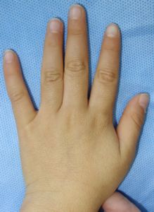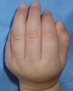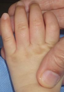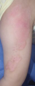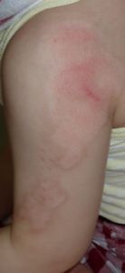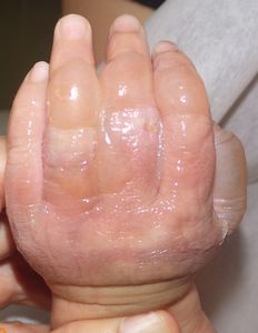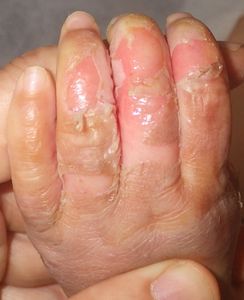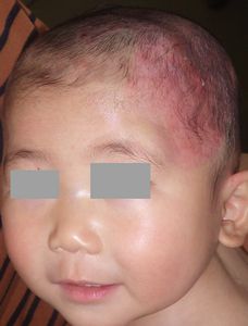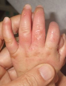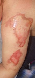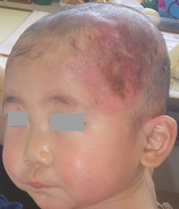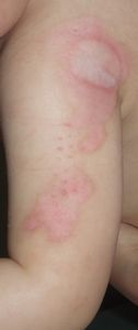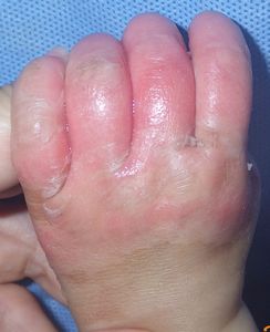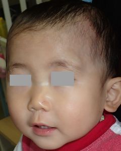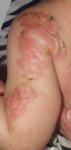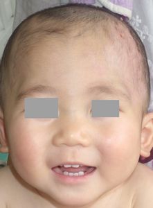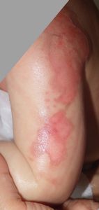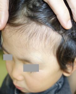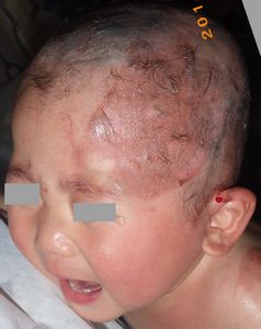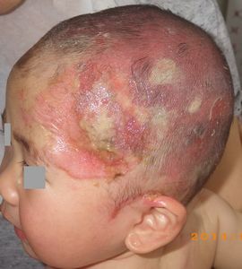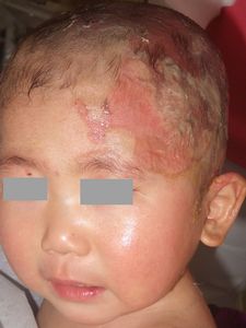 2014年5月10日午前中,母親が鍋でソウメンを茹でていて鍋の取っ手に引っかかって鍋を落としたところ,ハイハイして近寄ってきた患児にかかり,熱傷受傷。直ちに〇〇大学△△病院に救急搬送され,形成外科で治療(フィブラストスプレー+アズノール軟膏+モイスキンパッド)。両親がネットで熱傷治療について調べて湿潤治療を知り,当科に紹介状を書いてもらった。